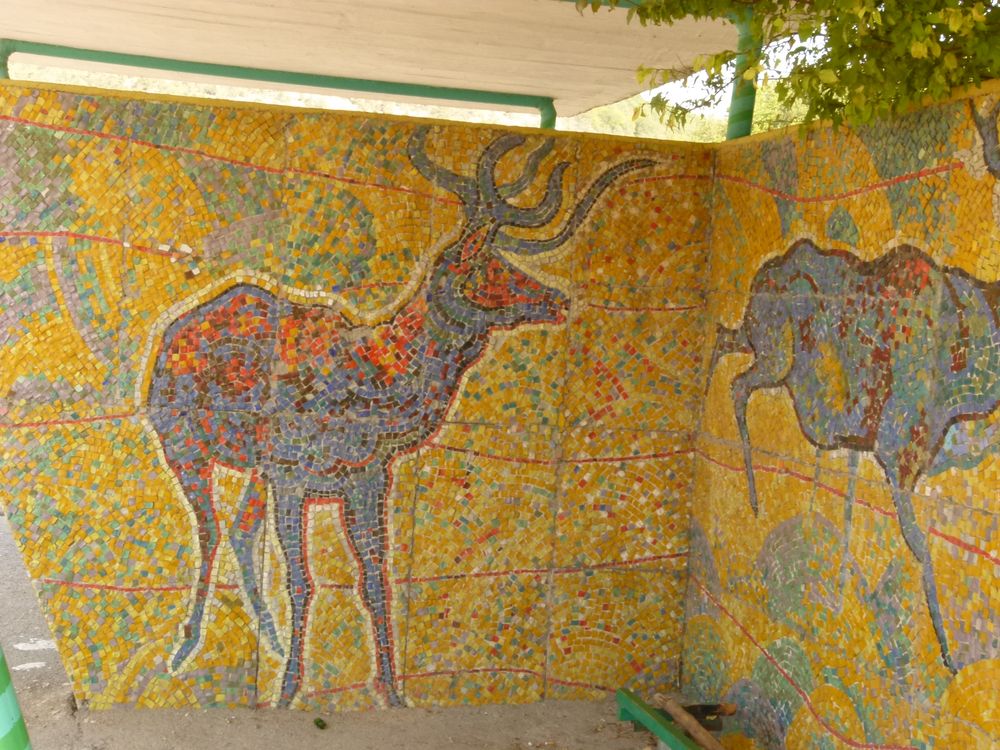 Это, наверное, самая любимая моя остановка. Стадо оленей бежит по осеннему лесу, почему-то все - величественные и мощные самцы, одна фигура сильно смахивает на лося :)) Сама постройка не представляет из себя ничего примечательного - простой навес из двух секций, зато мозаика великолепна как в отношении графики, так и в цветовом решении. Есть в ней что-то и от средневековых сцен охоты, и от наскальных изображений палеолита.